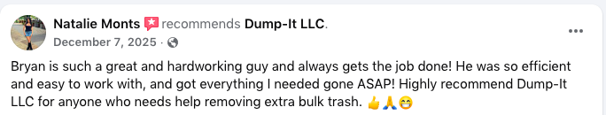 My name is Bryan. I founded DUMP-IT LLC to provide honest, hardworking, affordable junk removal. We offer practical solutions for homeowners and businesses lacking time or resources, with fair pricing, transparent service, and reliable effort. We do the heavy lifting so customers reclaim their space without inflated fees—serving the community with integrity and care.